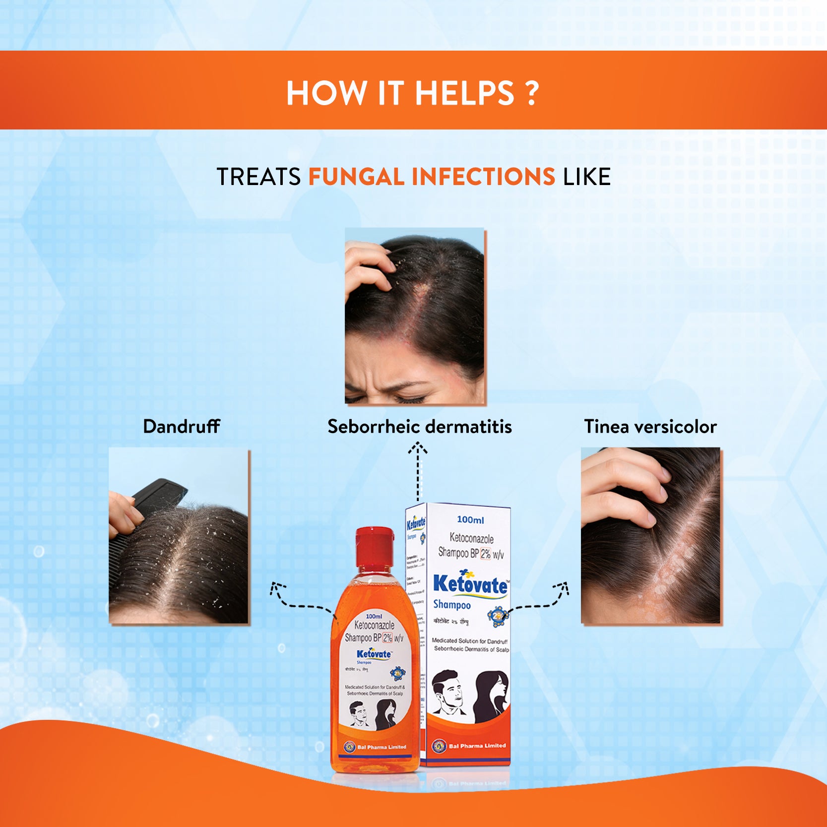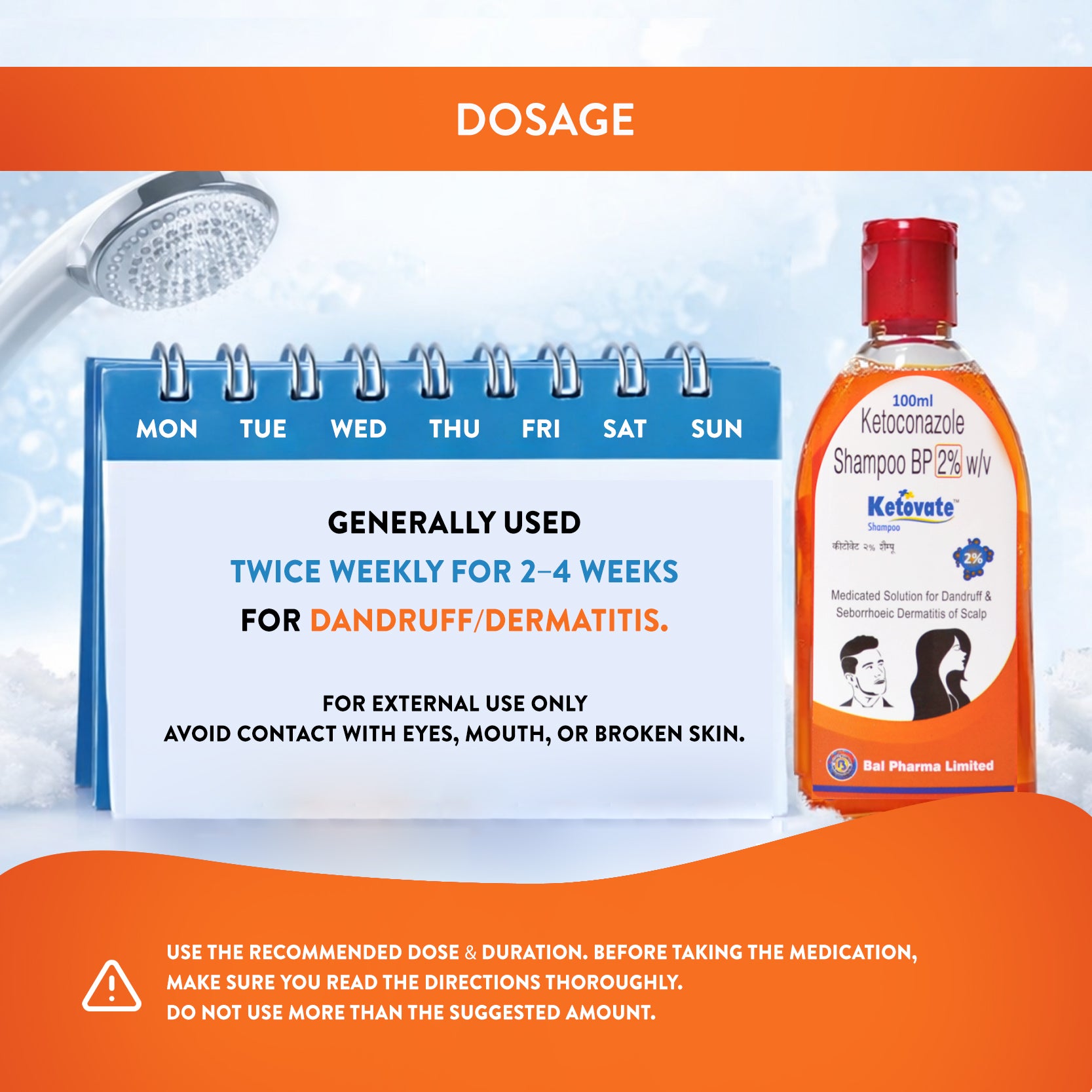 For dermatitis and dandruff, use KETOVATE 2% SHAMPOO twice weekly for 2–4 weeks. For tinea, use once daily for a maximum of 5 days. However, the dose and duration might differ for each patient, so consult your doctor before using it. Your doctor will determine the right dose and duration of therapy for you according to your age, body weight, and disease condition.