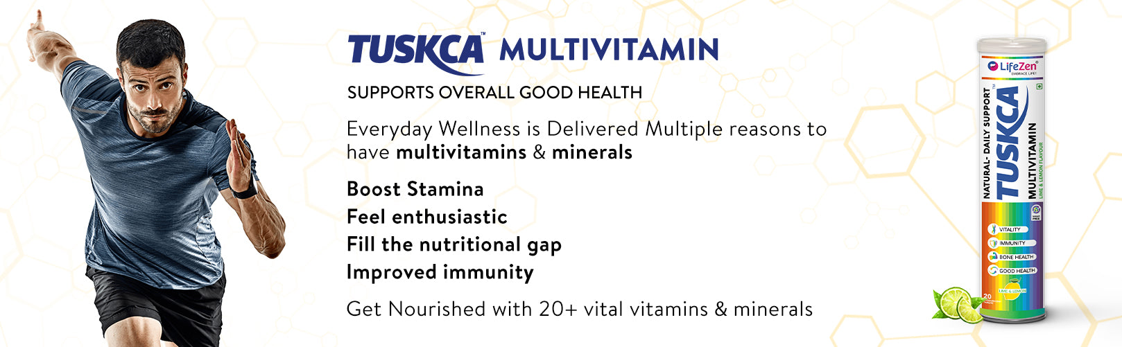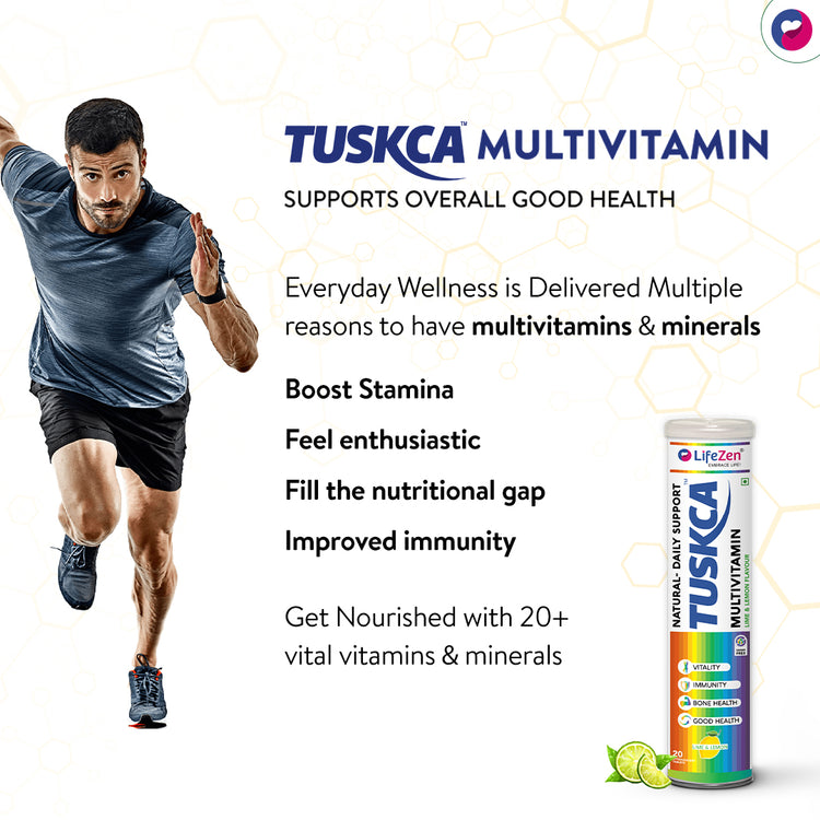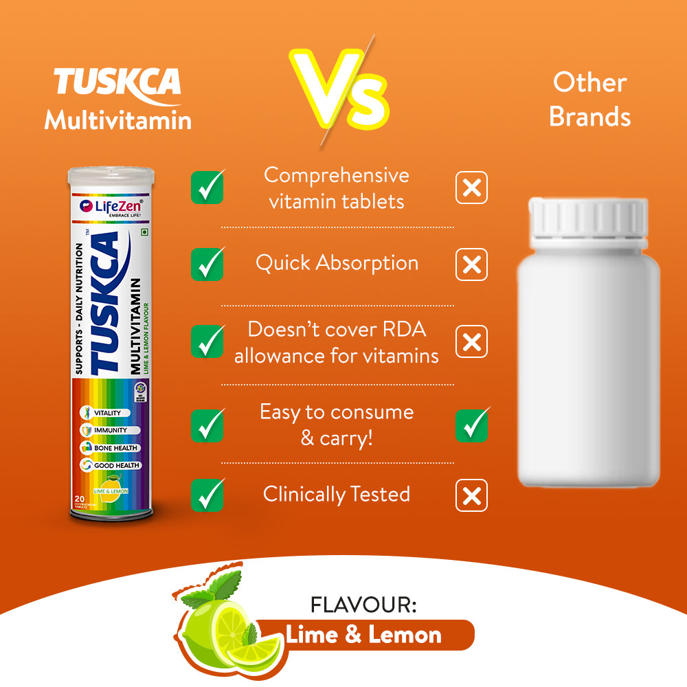 Tuskca multivitamin effervescent tablet is a fizzy, dissolvable tablet that contains a blend of 21 essential vitamins and minerals. When dropped into water, it dissolves and releases vitamins that support overall health, immunity, energy levels, hydration, and well-being.