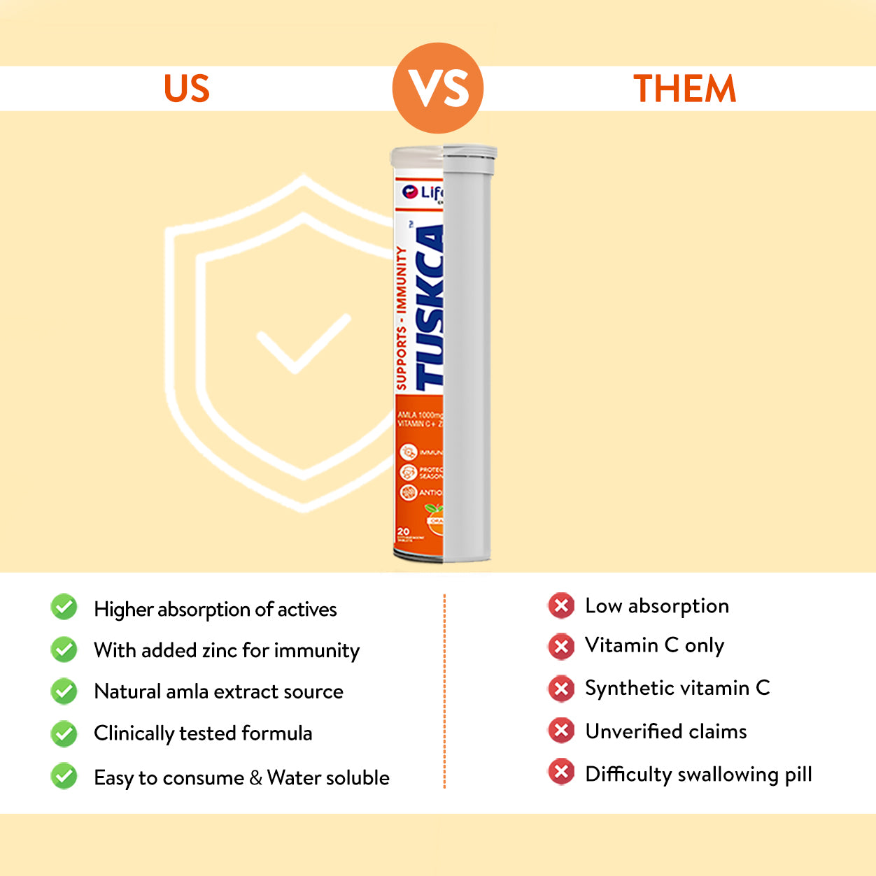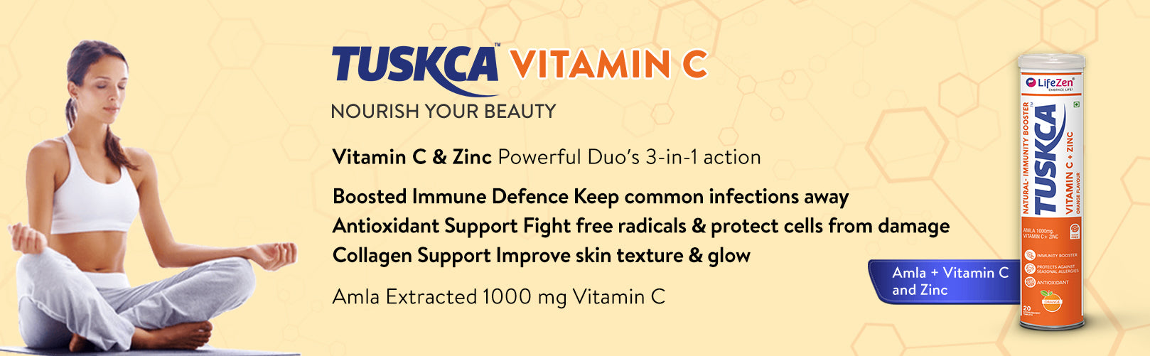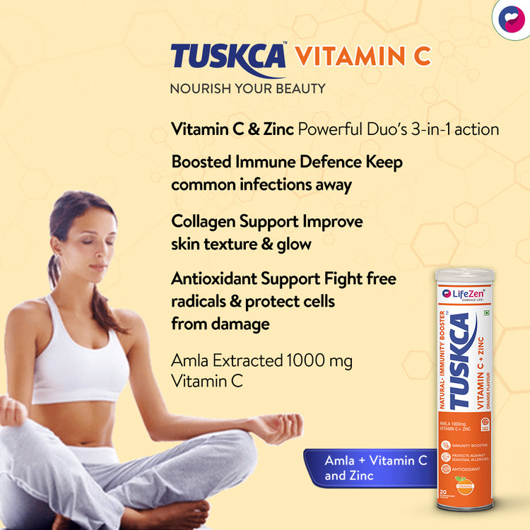 Tuskca vitamin C with zinc effervescent tablet is a powerful combination to provide immunity and antioxidants to the body. They dissolve in water, creating a fizzy drink that delivers a combination